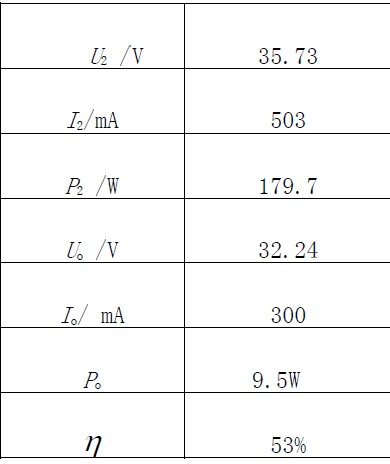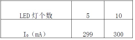輸入電壓為36.23V,設定電流為300mA,負載從5 個LED 到10 個LED 時輸出電流波動範圍是209mA~300mA。調整率為0.4%。負載調整率SL≤1%達到要求。
