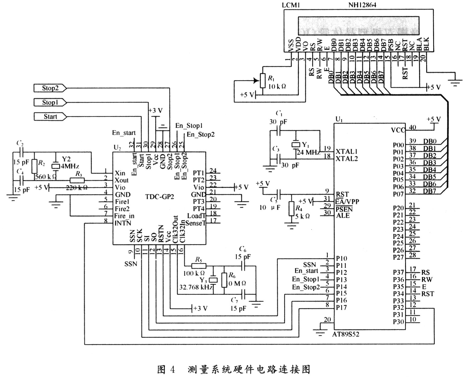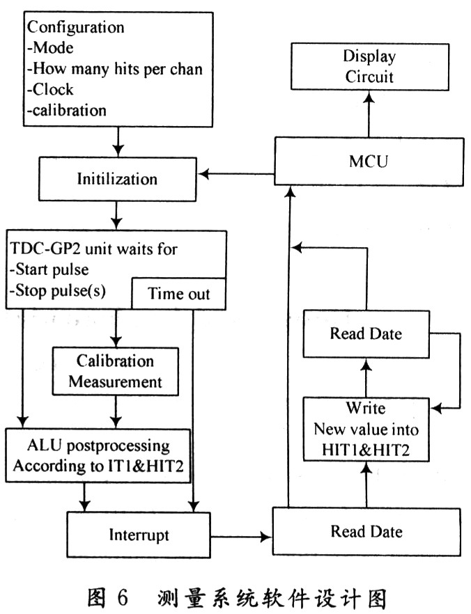 整個係統分為單片機係統模塊、TDC-GP2測量模塊和顯示模塊三部分。TDC-GP2作zuo為wei係xi統tong測ce量liang核he心xin單dan元yuan,可ke直zhi接jie對dui信xin號hao時shi間jian間jian隔ge進jin行xing測ce量liang,並bing通tong過guo單dan片pian機ji處chu理li後hou將jiang時shi間jian間jian隔ge數shu值zhi在zai液ye晶jing顯xian示shi器qi上shang顯xian示shi。與yu常chang用yong的de測ce量liang方fang法fa相xiang比bi,該gai方fang法fa所suo需xu外wai圍wei器qi件jian少shao,電dian路lu結jie構gou簡jian單dan,功gong耗hao低di。
