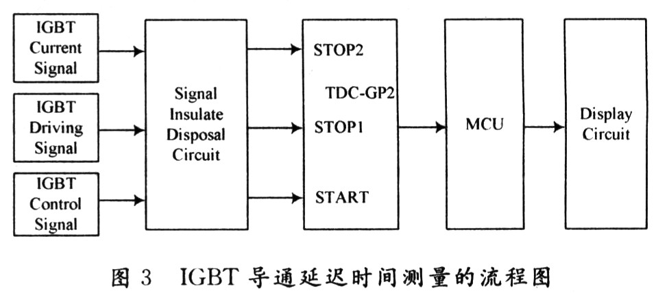 IGBT導通延遲時間的精確測量,是通過測量IG-BT的控製信號、驅動信號和導通電流信號間的時間間隔得到的,流程圖見圖3。通過信號處理隔離電路將控製信號、驅動信號和導通電流信號輸入時間測量芯片TDC-GP2。其中,IGBT的控製信號作為時間測量芯片TDC-GP2的START端口輸入,驅動信號和IGBT的導通電流信號作為STOP1和STOP2端的兩個脈衝輸入。由此可得START與STOP1端口的時間間隔為控製信號與驅動信號的延遲時間;START與STOP2端口的時間間隔為控製信號與IGBT導通信號的延遲時間,兩者的時間差即為IGBT相對於驅動信號的導通延遲時間。