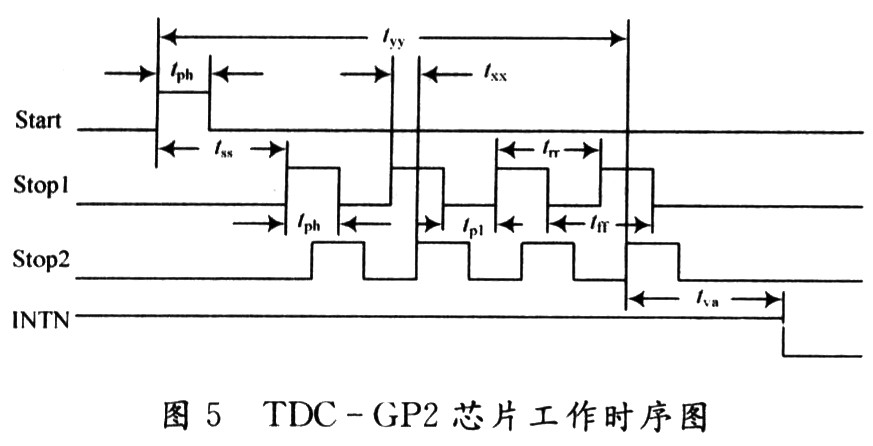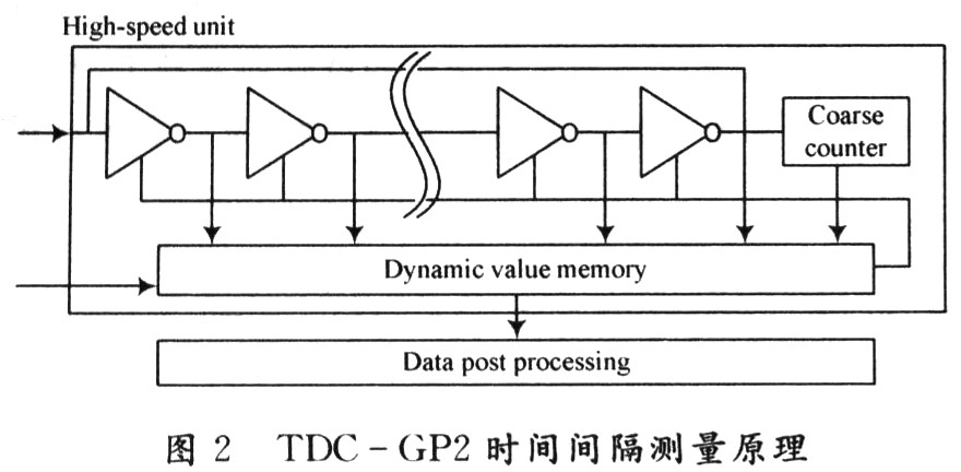 該係統主要由脈衝產生器、數據處理單元、時間數字轉換器、溫度測量單元、時鍾控製單元、配置寄存器以及與單片機相接的SPI接口組成。在實際應用中,由於TDC-GP2的功耗很低,使得TDC-GP2的輸入/輸出電壓(工作電壓)為1.8~5.5 V,核心電壓為1.8~3.6 V,所以可以采用電池供電,使用方便。同時單片機由4線的SPI接口相連,可以把TDC-GP2作為單片機的一個外圍設備來操作。通過內部ALU單元計算出時間間隔,並將結果送入結果寄存器保存起來。通過對TDC-GP2內部寄存器的設置,可以多次采樣並將結果保存。TDC-GP2是基於內部的模擬電路測量“傳輸延時”來進行的,是以信號通過內部門電路的傳播延遲來進行高精度時間間隔測量的。TDC-GP2時間間隔測量原理如圖2所示。