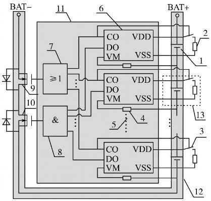 采用單節鋰電池保護芯片設計的具備均衡充電能力的鋰電池組保護板示意圖如圖1所示。其中:1為單節鋰離子電池;2為充電過電壓分流放電支路電阻;3為分流放電支路控製用開關器件;4為過流檢測保護電阻;5為省略的鋰電池保護芯片及電路連接部分;6為單節鋰電池保護芯片(一般包括充電控製引腳CO,放電控製引腳DO,放電過電流及短路檢測引腳VM,電池正端VDD,電池負端VSS等);7為充電過電壓保護信號經光耦隔離後形成並聯關係驅動主電路中充電控製用MOS管柵極;8為放電欠電壓、過流、短路保護信號經光耦隔離後形成串聯關係驅動主電路中放電控製用MOS管柵極;9為充電控製開關器件;10為放電控製開關器件;11為控製電路;12為主電路;13為分流放電支路。單節鋰電池保護芯片數目依據鋰電池組電池數目確定,串聯使用,分別對所對應單節鋰電池的充放電、過流、短(duan)路(lu)狀(zhuang)態(tai)進(jin)行(xing)保(bao)護(hu)。該(gai)係(xi)統(tong)在(zai)充(chong)電(dian)保(bao)護(hu)的(de)同(tong)時(shi),通(tong)過(guo)保(bao)護(hu)芯(xin)片(pian)控(kong)製(zhi)分(fen)流(liu)放(fang)電(dian)支(zhi)路(lu)開(kai)關(guan)器(qi)件(jian)的(de)通(tong)斷(duan)實(shi)現(xian)均(jun)衡(heng)充(chong)電(dian),該(gai)方(fang)案(an)有(you)別(bie)於(yu)傳(chuan)統(tong)的(de)在(zai)充(chong)電(dian)器(qi)端(duan)實(shi)現(xian)均(jun)衡(heng)充(chong)電(dian)的(de)做(zuo)法(fa),降(jiang)低(di)了(le)鋰(li)電(dian)池(chi)組(zu)充(chong)電(dian)器(qi)設(she)計(ji)應(ying)用(yong)的(de)成(cheng)本(ben)。