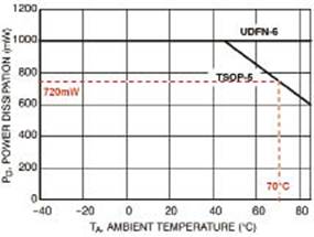 環境溫度低於70℃時,TSOP-5和µDFN-6封裝都可以耗散720mW的功率,因此能滿足這一應用的最壞情況要求。然而,µDFN-6封裝的功率耗散能力更強,與采用TSOP-5封裝的同等轉換器設計相比,能夠承受的溫度更高。