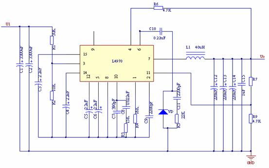 根據上麵的結果,我們采用L4970A芯片構成相關的充電電路對超級電容進行充電,如圖5所示,該電路可以提供10A的恒流充電電流,其輸出電壓由電阻R7和R9確定。