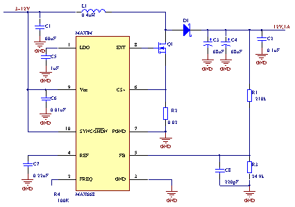 MAX668為固定頻率,電流反饋型PWM控製器,內部采用雙極型CMOS多輸入比較器,可同時處理輸出誤差信號、電流檢測信號和斜率補償信號,由於省去了傳統的誤差放大器,從而抑製了由誤差放大產生的相移。MAX668能夠驅動多種類型的N溝道MOSFET,這裏選擇的是FDS6680。由於芯片工作在100 kHz 以上的高頻狀態,所以二極管D1應選取可高速關斷的肖基特二極管,本文選擇的是MBR5340T3。