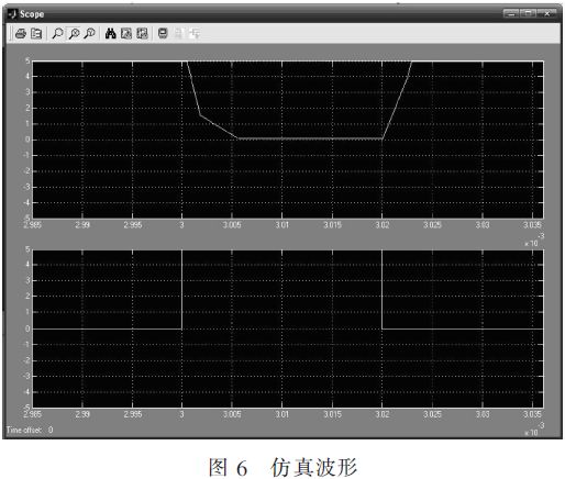設觸發脈衝周期為2 ms,脈衝寬度為2μs,如圖6中的第一示波器(圖的下部),仿真線前端的波形如圖6中的第二示波器(圖的上部)。由第二示波器可見,當觸發脈衝到來時,即IGBT網絡導通時,仿真線迅速放電,放電速率為5 000 V/6μs(即從滿電壓5 000 V至放電完成時間約為6μs),並且無反衝。當觸發脈衝過去時,即IGBT網絡斷開時,仿真線迅速充電,放電速率為5 000 V/3μs(即從充電開始至滿電壓5 000 V的時間約為3μs),並且無反衝。