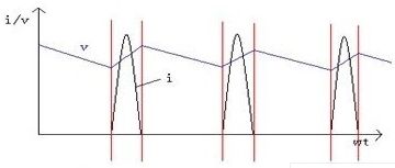 一般開關電源為容式濾波,在輸入與整流濾波部分電磁噪聲主要是由整流過程中造成的電流尖峰、電壓波動所引起的。正弦波電源經過電源濾波器進行差模、共模信號衰減後,由整流橋整流、電dian解jie電dian容rong濾lv波bo,得de到dao的de電dian壓ya作zuo為wei高gao頻pin逆ni變bian部bu分fen的de輸shu入ru電dian壓ya。由you於yu濾lv波bo電dian容rong的de存cun在zai,使shi整zheng流liu器qi不bu象xiang純chun整zheng流liu那na樣yang一yi組zu開kai通tong半ban個ge周zhou期qi,而er是shi隻zhi在zai正zheng弦xian電dian壓ya高gao於yu電dian容rong電dian壓ya時shi才cai導dao通tong,造zao成cheng電dian流liu波bo形xing非fei常chang陡dou峭qiao,同tong時shi電dian壓ya波bo形xing變bian得de平ping緩huan。電dian流liu、電壓的波形如圖2所示。