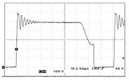 相xiang對dui於yu一yi般ban的de反fan激ji式shi變bian換huan器qi,準zhun諧xie振zhen隻zhi在zai原yuan來lai電dian路lu基ji礎chu上shang加jia了le一yi個ge無wu源yuan器qi件jian電dian容rong器qi,不bu會hui在zai電dian路lu中zhong產chan生sheng多duo餘yu的de電dian磁ci噪zao聲sheng。通tong過guo改gai變bian控kong製zhi方fang式shi,利li用yong變bian壓ya器qi初chu級ji電dian感gan與yu電dian容rong器qi之zhi間jian發fa生sheng諧xie振zhen,在zai開kai關guan管guan電dian壓ya波bo形xing出chu現xian波bo穀gu處chu開kai通tong;關斷時利用電容器進行緩衝,可以大大降低開關管上的關斷電壓尖峰和開通電流尖峰,從而降低電磁幹擾。利用安森美的NCP1207製作的準諧振反激式開關電源,其開關管上的電壓波形如圖6所示:
