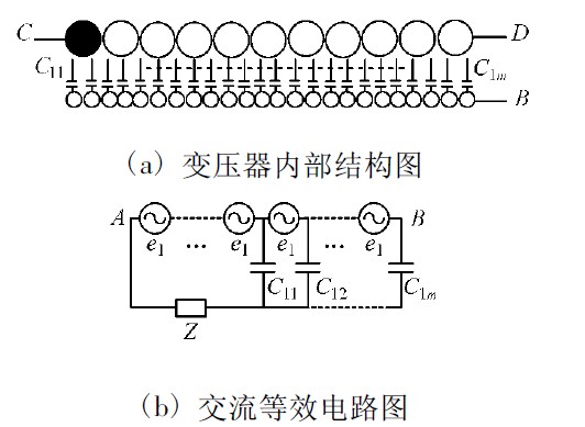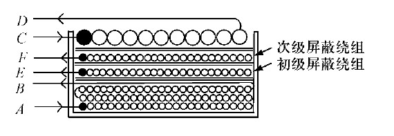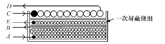 在變壓器內部再增設次級屏蔽繞組如圖12所示,並將E 點與A 點相連,將F 點與C 點相連,此時,一次側屏蔽繞組與次級屏蔽繞組的感應電動勢和寄生電容分布情況是基本一致的,近似有: