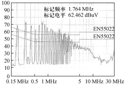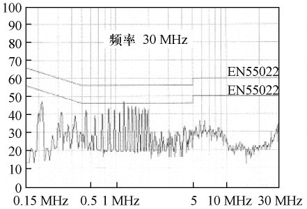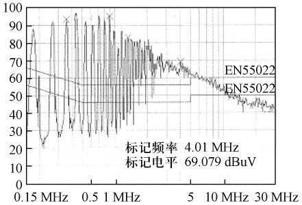 根據圖3 所示的結構。繞製變壓器,並在交流整流濾波後增設13 mH 差模濾波電感和6. 8差模濾波電容,對開關電源進行傳導EMI 測試,結果如圖6 所示。由圖6 可見,傳導EMI 非常嚴重,不能通過電磁幹擾測試。在交流整流前增設35 mH 共模濾波電感,傳導EMI 測試結果如圖7 所示,產品即可通過測試。比較測試結果可得出:在圖3 所示的電路中,主要是由於大量共模傳導EMI,才使電源不能通過電磁幹擾測試。