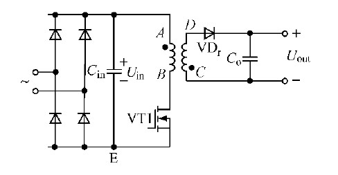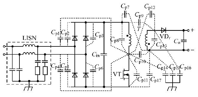 在圖1 所示的反激式開關電源中,變換器工作於連續模式時,開關管VT 導通後,B 點電位低於A 點,一次繞組匝間電容便會充電,充電電流由A 流向B;VT 關斷後,寄生電容反向充電,充電電流由B 流向A。這樣,變壓器中便產生了差模傳導EMI。同時,電源元器件與大地之間的電位差也會產生高頻變化。由於元器件與大地、機殼之間存在著分布電容,便產生了在輸入端與大地、機殼所構成回路之間流動的共模傳導EMI 電流。