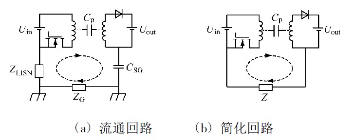 jutidaobianyaqizhong,yiciraozuyuerciraozuzhijiandedianweichayehuichanshenggaopinbianhua,tongguojishengdianrongdeouhe,congerchanshenglezaiyiciceyuercicezhijianliudongdegongmochuandaoEMI 電流。交流等效回路及簡化等效回路如圖4所示。圖4 中:ZLISN為線性阻抗穩定網絡的等效阻抗;CP為變壓器一次繞組與二次繞組間的寄生電容;ZG為大地不同點間的等效阻抗;CSG為輸出回路與地間的等效電容;Z 為變壓器以外回路的等效阻抗。