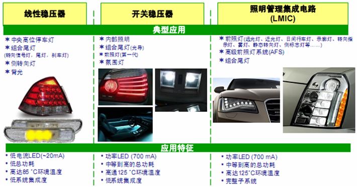 隨著LED性能不斷提升及成本不斷下降,在汽車內部及外部照明中的應用領域越來越寬。不同應用對LED電流的要求又各不相同,故需要結合具體應用要求,選擇適合的LED驅動器方案,如線性恒流穩流器、線性穩壓器或開關穩壓器等。本文介紹幾種應用比較廣泛的LED驅動器及具體方案,供設計人員在進行汽車照明設計時參考。