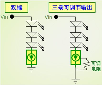 適合低電流LED應用的CCR,可以采用安森美半導體運用專利自偏置晶體管(SBT)技術開發出來得NSI45係列。這係列CCR包含雙端固定輸出和三端可調節輸出兩種類型,電流等級涵蓋10至180 mA,雙端及三端CCR電路圖如圖2所示。其中三端可調節輸出CCR包括電流30至80 mA(SOT-223)及60至150 mA(DPAK)等不同選擇,能夠用於滿足特定電流設置要求。