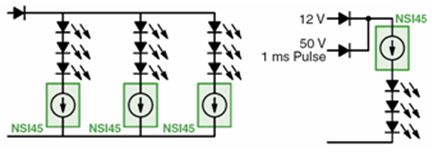 CCR適合高邊(High-side)及低邊(Low-side)應用;既能用單個CCR驅動1串或多串LED,也能並聯多個CCR驅動一串或多串LED。 CCR汽車中央高位停車燈應用電路如圖3所示。