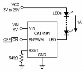 而在要求驅動大電流的高亮度LED汽車照明應用中,可以采用安森美半導體的CAT4101高亮度線性LED驅動器。CAT4101能驅動一串電流高達1 A的高亮度LED,且滿載時的壓降僅為極低的0.5 V。這種簡單方案不要求電感,消除開關噪聲,將元件數量減至最少,並簡化設計,典型應用電路如圖5所示。