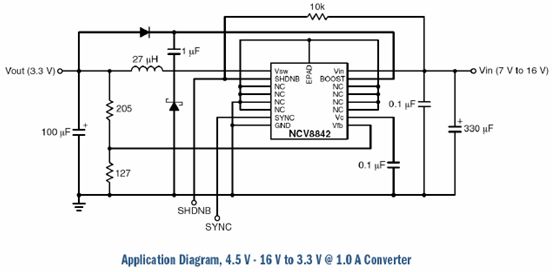 在降壓開關驅動器方麵,包括NCV8842、NCV8843及NCV51411等產品,適合於車身/遠程信息係統等應用。NCV8842/3是帶同步功能的1.5 A、170/340 kHz降壓驅動器,支持4.5 V至40 V輸入電壓,而輸出電壓可從1.27 V開始編程設定。同步引腳功能用於改善EMI性能。