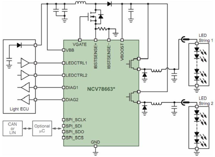 一般而言,汽車前照燈要求支持從單個LED到多串LED,電壓可高達60 V;此外,還要求支持脈寬調製(PWM)調光(如用於示廓燈)、高集成度、高能效、LED串低電磁輻射、集成診斷及通信接口等。安森美半導體針對LED汽車前照燈係統開發了NCV78663電源鎮流器及雙LED驅動器。NCV78663是先進的高可靠性、高能效的係統級芯片(SoC) LED驅動器,支持達2 A電流,提供高於90%的總能效,驅動高達60 V電壓的多串LED,能以PWM調光維持色溫及控製平均電流,使設計人員能夠以一顆高集成度的SoC控製遠光燈及近光燈、日間行車燈、轉向指示燈及霧燈,所需外部元件極少。這器件通過SPI接口與外部微控製器通信,在上電後動態地控製係統參數、檢測LED工作狀態並反饋診斷信息。圖8顯示的是NCV78663在先進的汽車前照燈應用中的電路圖。
