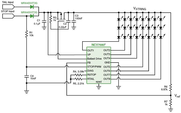 圖9: NCV7680在LED組合尾燈中的應用電路圖