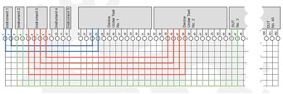 就拿前麵提到的那個例子來說,采用這種矩陣排列方式隻需要330個測試點(300個待測設備接入點和30個測試裝置接入點)以及8條Y向連接線即可,一共需要2640個繼電器,僅為上麵提到的那種排列方法需要300乘30個點的繼電器數量的30%。這樣就可以在開關係統中節省了很大的開支。