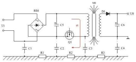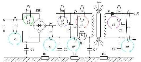 圖1是磁感應產生傳導幹擾的原理圖,圖1表示開關電源變壓器產生的漏磁通穿過其它電路時,在其它電路中也產生感應電動勢,其中漏磁通M1、M2、M3產生的感應電動勢e1、e2、e3屬於是差模幹擾信號;M5、M6、M7、M8產生的感應電動勢e5、e6、e7、e8屬於是共模幹擾信號。