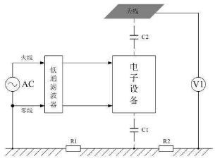 輻射幹擾一般是通過電磁感應的形式在空間進行傳播的,圖4是測試電子設備產生輻射幹擾的基本方法,或表示電子設備產生的幹擾信號通過電磁感應向空中輻射的原理。圖4中,電子設備表示幹擾信號源,V1表示測量儀表,C1表示電子設備對大地的電容,C2表示電子設備與天線偶合的電容,即:電子設備通過電場對天線產生感應,這裏的天線也可以看成是被幹擾的設備。圖4deceshifangfajiushiceshidianzishebeizhouweiguidingjulimouchudediancichangqiangdu,youyuganraoxinhaoyibandoushiyigepinlvchengfenfeichangfengfudefeizhengxianbo,yinci,wufaduitajinxingzhijieceliang,zhinengduitaqizhongmouyigepinlvxinhaodandujinxingceliang。