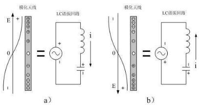 天線來回極化的工作原理可以等效成一個串聯諧振電路,當天線在電場力的作用下被極化帶電時,它又相當於一個電容在充電;當天線中的載流子在電場力的作用下來回移動時,它又相當於一個電感,並且在天線的周圍會產生磁場。