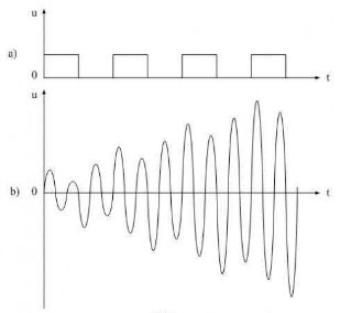 圖6是諧振回路產生諧振的工作原理圖。圖6-a)是一個含有諧波分量非常豐富的電壓方波,圖6-b)是LC串聯回路產生諧振時的電壓波形。當電壓方波作用於LC串聯回路時,方波的前後沿都會對LC串聯回路產生激勵(即接收能量),每次激勵過後又會產生阻尼振蕩(即損耗能量),當輸入電壓波形的上升率dv/dt值大於諧振回路波形(正弦波)的上升率時,電路就會產生激勵;當輸入電壓波形的上升率dv/dt值小於諧振回路波形的上升率時,電路就會產生阻尼。