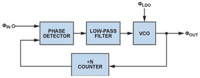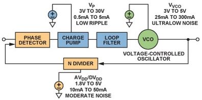 鎖相環(PLL)是現代通信係統的基本構建模塊PLLs通常用在無線電接收機或發射機中,主要提供"本振"(LO)功能;也可用於時鍾信號分配和降噪,而且越來越多地用作高采樣速率模數或數模轉換的時鍾源。由於每一代PLL的噪聲性能都在改善,因此電源噪聲的影響變得越來越明顯,某些情況下甚至可限製噪聲性能。本文討論圖1所示的基本PLL方案,並考察每個構建模塊的電源管理要求。