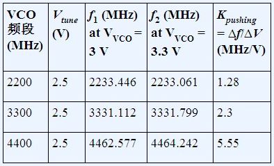VCO推壓的測量方法如下:向VTUNE引腳施加直流調諧電壓,改變電源電壓並測量頻率變化。推壓係數是頻率變化與電壓變化之比,如表1所示,使用的是ADF4350 PLL.