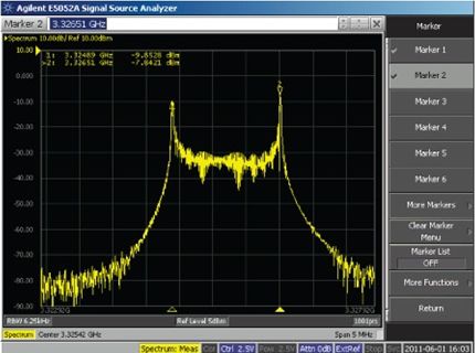 另一種方法:將低頻方波直流耦合至電源內,同時觀察VCO頻譜任一側上的頻移鍵控 (FSK)調製峰值(圖2)。峰值間頻率偏差除以方波幅度,便得出VCO推壓係數。該測量方法比靜態直流測試更精確,因為消除了與直流輸入電壓變化相關的任何熱效應。圖2顯示ADF4350 VCO輸出在3.3 GHz、對標稱3.3 V電源施加10 kHz、0.6 V p-p方波時的頻譜分析儀曲線圖。對於1.62 MHz/0.6 V或2.7 MHz/V的推壓係數,最終偏差為3326.51 MHz – 3324.89 MHz = 1.62 MHz.該結果可與表1中的靜態測量 2.3 MHz/V比較。