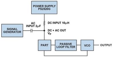 電荷泵的低功耗使其看似頗具吸引力,可使用升壓轉換器從較低的電源電壓產生高電荷泵電壓,然而與此類DC-DC轉換器相關的開關頻率紋波可能在VCO的輸出端產生幹擾雜散音。高PLL雜散可能造成發射機發射屏蔽測試失敗,或者降低接收機係統內的靈敏度和帶外阻塞性能。為幫助指導轉換器紋波的規格,使用圖6的測量設置針對各種PLL環路帶寬獲得全麵電源抑製曲線圖與頻率的關係。