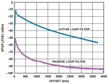 電荷泵將鑒相器誤差電壓轉換為電流脈衝,並通過PLL環路濾波器進行積分和平滑處理。電荷泵通常可在最多低於其電源電壓(VP)0.5 V的電壓下工作。例如,如果最大電荷泵電源為5.5 V,那麼電荷泵隻能在最高5 V輸出電壓下工作。如果VCO需要更高的調諧電壓,則通常需要有源濾波器。有關實際PLL的有用信息和參考設計,請參見電路筆記CN-0174,5,處理高壓的方式請參見利用高壓VCO設計高性能鎖相環,"6該文章發表於模擬對話第43卷第4期(2009)。有源濾波器的替代方案是使用PLL和針對更高電壓設計的電荷泵,例如ADF4150HV ADF4150HV可使用高達30 V的電荷泵電壓工作,從而在許多情況中省去了有源濾波器。
