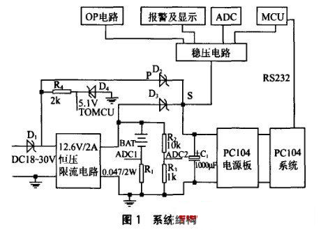 係統使用直流18~ 30 V 輸入, 可以直接使用筆記本電源。D1 用於防止電源方向插反。12. 6 V/ 2 A 恒壓限流電路為本電路核心, 在輸出電壓低於12. 6 V 時工作在2 A 恒流狀態, 當輸出電壓達到12. 6 V 時,使輸出電壓恒定。D2、D3 和C1 完成電源切換功能。外部電源供電時, 由於P 端電壓總是保持在12. 6 V 以上, S 端通過外部電源供電, 若無外部電源時, 由於電池電壓比P 端的電壓高, 則通過電池對係統進行供電。穩壓電路主要負責將S 端的電壓轉換為係統所需的各種電壓。ADC1 和A DC2 分別為電流和電壓采集端, ADC1 和ADC2 端的信號經過OP 電路放大,然後輸入到ADC 電路, MCU 把各種相關數據通過RS232傳送到PC104 係統。R4 和D4 完wan成cheng供gong電dian狀zhuang態tai的de檢jian測ce,用yong於yu檢jian測ce係xi統tong是shi外wai部bu電dian源yuan供gong電dian還hai是shi電dian池chi供gong電dian,使shi係xi統tong自zi動dong調tiao整zheng自zi動dong關guan機ji或huo自zi動dong待dai機ji的de等deng待dai時shi間jian。電dian路lu同tong時shi提ti供gong聲sheng光guang方fang式shi的de報bao警jing及ji顯xian示shi功gong能neng, 當出現電壓過低等情況時,能以比較醒目的方式進行提醒。PC104 電源板和PC104 係統是本電路的負載。電路中D1 、D2 、D3均為肖特基二極管,肖特基二極管具有正向壓降低、反向恢複時間短等優點; R1 、R2、R3 為1 %精密電阻。
