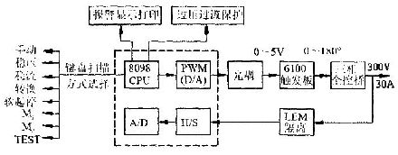 係統工作在開環狀態,利用8098的PWM口,經濾波後輸出一個0~5V的控製電壓信號給觸發板,使整流橋相應輸出電壓為0~300V.該方式主要用於係統主電路的檢修和維護。