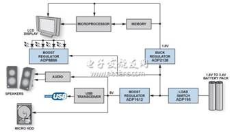 圖1顯示采用兩節串聯的AA電池供電的典型低功耗係統。電可用輸出範圍約為1.8 V至3.4 V,而IC工作時需要1.8 V和5.0 V 電壓。升壓轉換器可在不增加電池單元數量的情況下提升電壓,從而為WLED背光、微型硬盤驅動器、音頻設備和USB外設供電,而降壓轉換器可為微處理器、內存和顯示器供電。