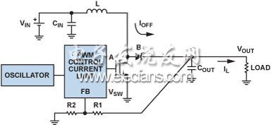使用肖特基二極管代替開關B的調節器定義為異步 (或非同步), 調節器,而使用FET作為開關B的調節器定義為同步調節器。圖3中,開關A和B已分別使用內部NFET和外部肖特基二極管來實施,從而形成異步升壓調節器。對於需要負載隔離和低關斷電流的低功耗應用,可添加外部FET,如圖4所示。將器件的EN引腳驅動至0.3 V以下便可關斷調節器,使輸入與輸出完全斷開。