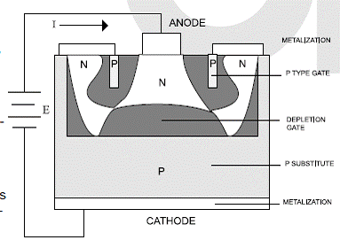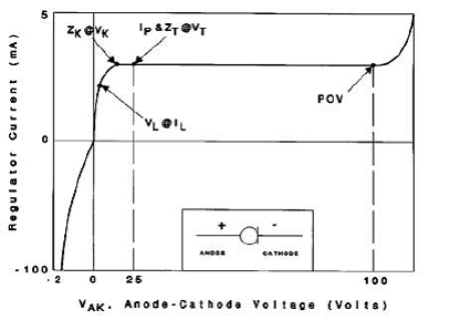 當一個反向偏壓加到PN結的陰極和陽極時,這個恒流二極管開始導通,當反向偏壓增加到VL時(見圖2),其電流由於N區的體電阻也跟著增加,當電流增加到曲線的拐點時,在N區和P型柵之間形成一個耗盡層。這個耗盡層減小了N區中電流的路徑也就減慢了電流的增加速度。結果這個耗盡層遇到了P型柵於是就產生了夾斷效應,這使得電流變成恒定而幾乎和所加電壓無關,直到所加電壓達到一個擊穿點Vb。如果所加電壓反過來,那麼就相當於一個正向電壓加到一個PN結,其特性就和一個普通二極管加上正向電壓時一樣。