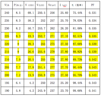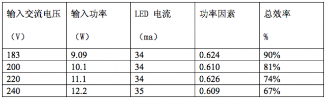 下麵舉一個實測的結果為例,這是一個80顆3014串聯的球泡燈,采用了5顆Semitek 的S-562T並聯。它在不同的輸入市電電壓時,所測得的結果如下表所示。