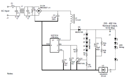 其實這個電源的核心就是一個恒流二極管NSI45025,以確保LED恒流在25mA。所以它隻能用於小功率貼片式的LED。其中外加的集成電路NCP1014實際上是一個有源式的功率因數校正(PFC),可以把它的功率因數提高到>0.9以滿足美國能源之星的要求。輸入端的L1,C1,C2是一個防電磁幹擾EMI的濾波器。它的缺點是非隔離,所以220V會直接加到負載LED上。但是歐盟IEC 61347-2-13 (5/2006)標準規定在LED負載端電壓不可超過25VAC或35VDC。所以采用非隔離電源是無法出口歐盟的。