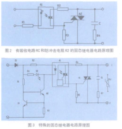 圖1、圖2 和圖3 三種電路都能實現固態繼電器的功能。圖1 是固態繼電器最簡單的電路原理圖,圖中A1 是交流光耦,A 2 是雙向可控矽。常用在小型的S S R ,使用時,用戶往往在外麵增加器件來改善性能。圖2 是在圖1 的基礎上增加了RC 吸收電路和防衝擊電阻R2 。R 2是保護光耦,抑製在導通瞬間流過光耦的衝擊電流。附加這些器件後,大大改善了SSR 的EMC 特性和浪湧對光耦的衝擊性能。因此該電路常用在可靠性較高的場合。圖3 是一種特殊的電路,常用在高可靠性和E M C 等級較高的SSR 設計中。圖中的二極管D1 可防止輸入反極性。由Q1、Q2、R1 及R3 組成恒流電路,保證當輸入電壓變化時,光耦A 1 的電流恒定。R C 電路C 1 、R 7 和R 6 的功能與圖2 的相同。該電路還增加了壓敏電阻R V 。R V不僅加強了S S R 的過壓保護能力,而且大大改善了其E M C 性能。