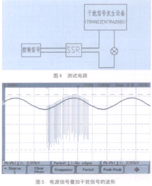 圖4 所示為測試電路。對SSR 來說,有信號源(穩壓電源)、小於1 米的連線、負載及有關儀器;圖5 為電源信號疊加幹擾信號的波形。