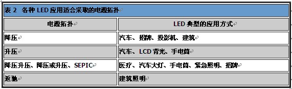 如同表2所示,LED已廣泛運用於各領域,因此需要許多種類的電源拓撲,支持LED的應用。一般而言,必須考慮輸入電壓、輸出電壓及對隔離的需求,以做出適當選擇。