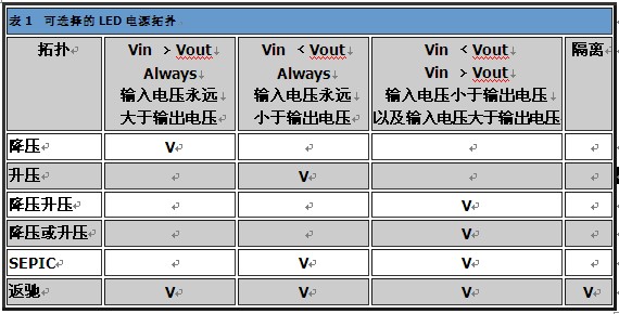 表1的信息可供作選擇LED驅(qu)動(dong)器(qi)最(zui)佳(jia)切(qie)換(huan)拓(tuo)撲(pu)的(de)參(can)考(kao)。除(chu)了(le)這(zhe)些(xie)拓(tuo)撲(pu)之(zhi)外(wai),也(ye)可(ke)以(yi)使(shi)用(yong)簡(jian)單(dan)的(de)電(dian)流(liu)限(xian)製(zhi)電(dian)阻(zu)或(huo)是(shi)線(xian)性(xing)穩(wen)壓(ya)器(qi),不(bu)過(guo)這(zhe)些(xie)方(fang)法(fa)通(tong)常(chang)會(hui)耗(hao)用(yong)過(guo)多(duo)功(gong)率(lv)。輸(shu)入(ru)電(dian)壓(ya)範(fan)圍(wei)、驅動的LED數目、LED電流、隔離、電磁幹擾(EMI)限製以及效能,都是相關的設計參數。大部分的LED驅動電路可分為以下幾種拓撲類別:降壓、升壓、降壓升壓、SEPIC以及返馳。