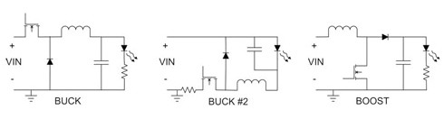 圖1顯示三個基本電源拓撲的例子,第一張圖所顯示的降壓穩壓器,可使用於輸出電壓永遠小於輸入電壓的情形。圖1中,降壓穩壓器改變金屬氧化半導體場效晶體管(MOSFET)的導通時間,以控製進入LED的電流。可越過電阻測量電壓以進行電流偵測;電阻與LED為串聯狀態。驅動MOSFET是本方法在設計上的重大挑戰,如果從成本及效能的觀點來看,建議使用須要浮接閘極驅動的N信道FET。N信道FET須要使用驅動變壓器或是浮動驅動電路,兩者都可維持電壓高於輸入電壓。