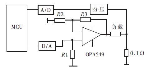 在該電源係統中, 主要為負載提供大電流, 采用PID 控製算法控製負載的發光強度。輸入為單片機經DAC輸出的控製電壓, 一路為比例放大電路, 如圖1 所示增益G=1+R3/R2.電流型DAC 通過R1 轉換成電壓, 控製OPA549 .輸出電流經采樣電阻轉換為采樣電壓, 送入A/D 轉換器反饋至單片機進行偏差值補償。