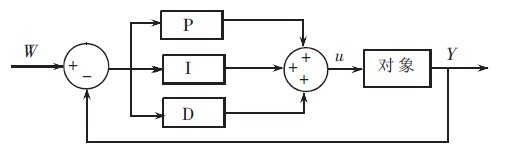 PID 控製原理如圖2 所示。PID 控製是一種線性調節器, 它把設定值W 與實際輸出值相減, 得到控製偏差e .偏差值e 經比例、積分、微分後通過線性組合構成控製量U, 對對象進行控製。其中比例調節器起到基礎調節作用, 主要對控製係統的靈敏度和控製速度有影響。積分調節器可以自動調節控製量, 消除穩態誤差,使係統趨於穩定。微分調節器可以減小超調, 克服振蕩, 同時加快係統的穩定速度, 縮短調整時間, 從而改善係統的動態性能。