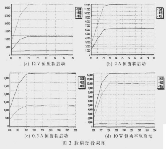 從圖3 的軟啟動效果圖可以看出, 在恒定電壓、電流、功率的模式下工作時, 係統開機過程超調量很小, 有效地控製了啟動過程, 防止了啟動過程產生過大的擾動電壓, 產生過大的功率, 有效地保護了負載。