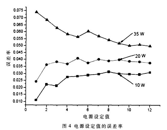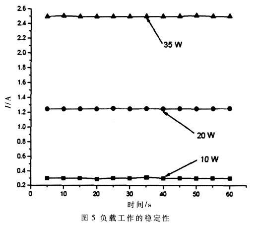 由於輸出電流達到8 A, 對電源的功率要求較高, 易產生噪聲, 這種隨機噪聲也會對輸出電流產生一定的影響。為減弱這種噪聲, 各個模塊分別供電, 以減少交叉幹擾, 同時在電路板上多加裝去耦濾波電容, 減小幹擾的影響, 同時OPA549 能有效地抑製紋波。影響電源穩定性的因素很多, 如負載的變化、取樣電阻的變化、A/D、D/A 的影響等。如圖4 所示, 不同負載的情況下, 電源誤差不同。10 W 的負載, 由於功率較低, 在電壓、電流增加時, 誤差變化也較小。35 W 的負載, 由於功率較大, 工作電流的變化範圍比較大, 功耗較大, 電源的誤差變化相應地也比較大。如圖5, 在10 W、20 W 和35 W 的負載時, 工作狀態穩定, 能夠滿足大電流、大功率的需要。