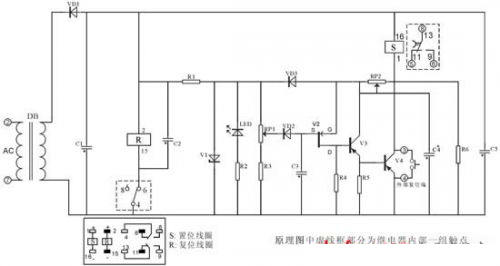 由V2 P溝道場效應管、V3、V4三極管以及繼電器為主要器件構成的斷電延時型繼電器示於圖2。如下:端加入工作電源後,C1~C5都按其回路完成充電過程(充電時間應參照產品規定的時間)。同時內部2繞組閉鎖繼電器R複位線圈得電工作(虛框內轉換觸點4與6由電源接通轉為斷開狀態,4與8接通),相應外部觸點進行轉換端接通,呈延時工作狀態)。