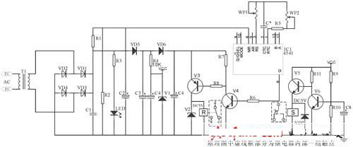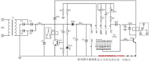 該電路核心部分由IC4541構成,延時設定由RP2、C*設定,A-B端根據需求接相應高、低電平(設定端)內部2繞組閉鎖繼電器采用DC12V(因繼電器工作電壓與IC4060組成延時電器要低,則為保證其驅動則分別由V6、V7、V1、V3構成)。其中C2為二次儲能器件,可根據延時的長短予以調整,C4為完成S置位線圈工作。
